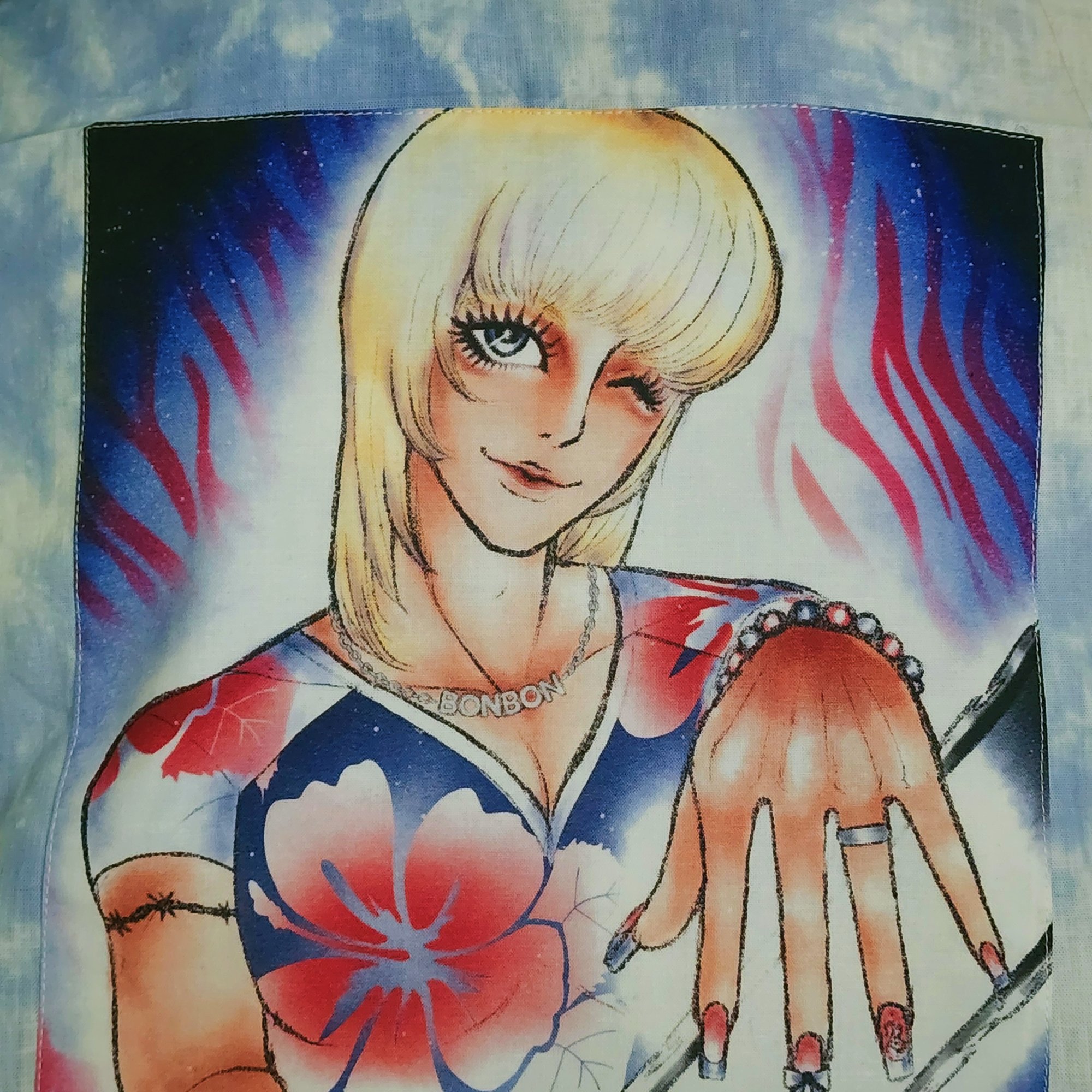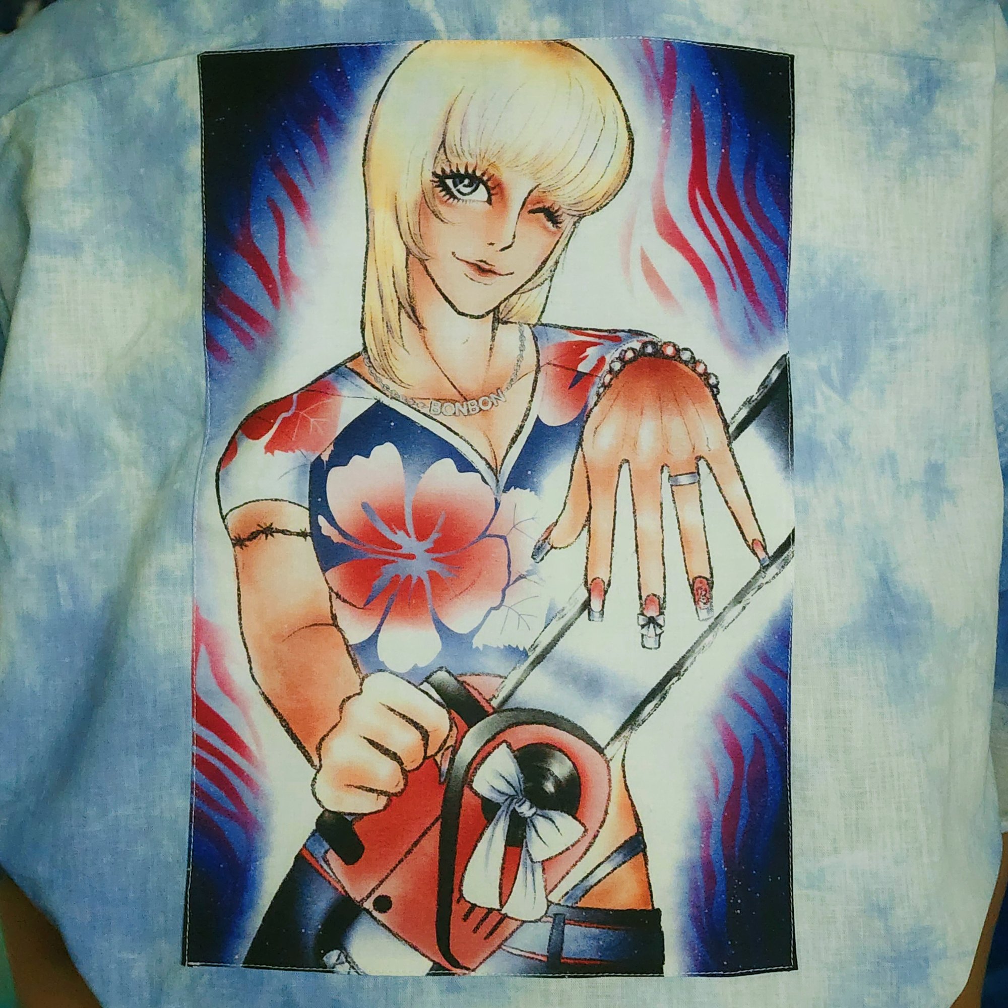A light off-shoulder jacket. Perfect for protecting your skin from the sun in summer, or layering as a conversation piece in any season. Handmade, hand-dyed with fiber-reactive dyes. 100% cotton, custom-printed art applique, a polyester satin accent tag, and cotton twill ties that may be tied in the front or back underneath the arms to keep it from falling off your shoulders during strenuous tasks.