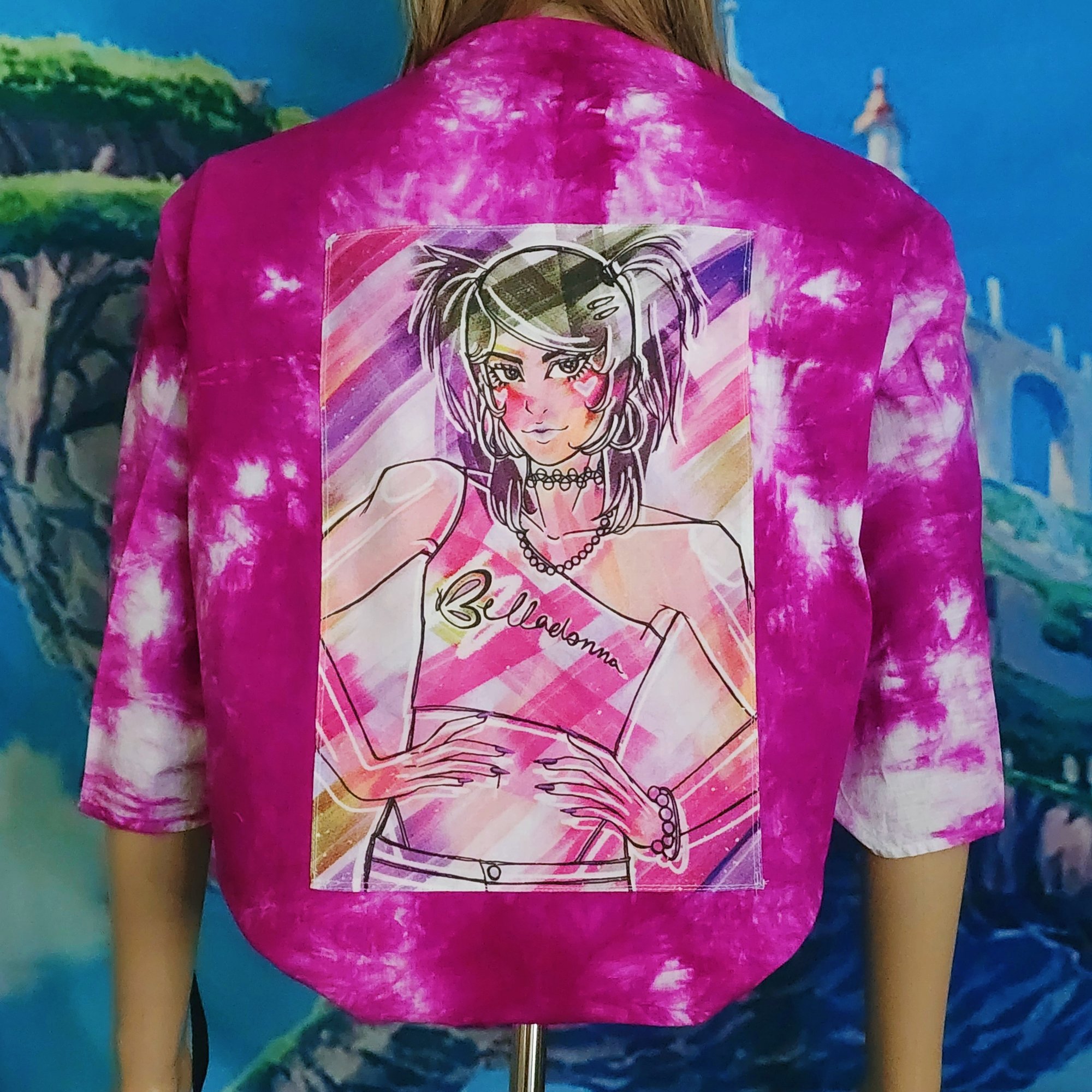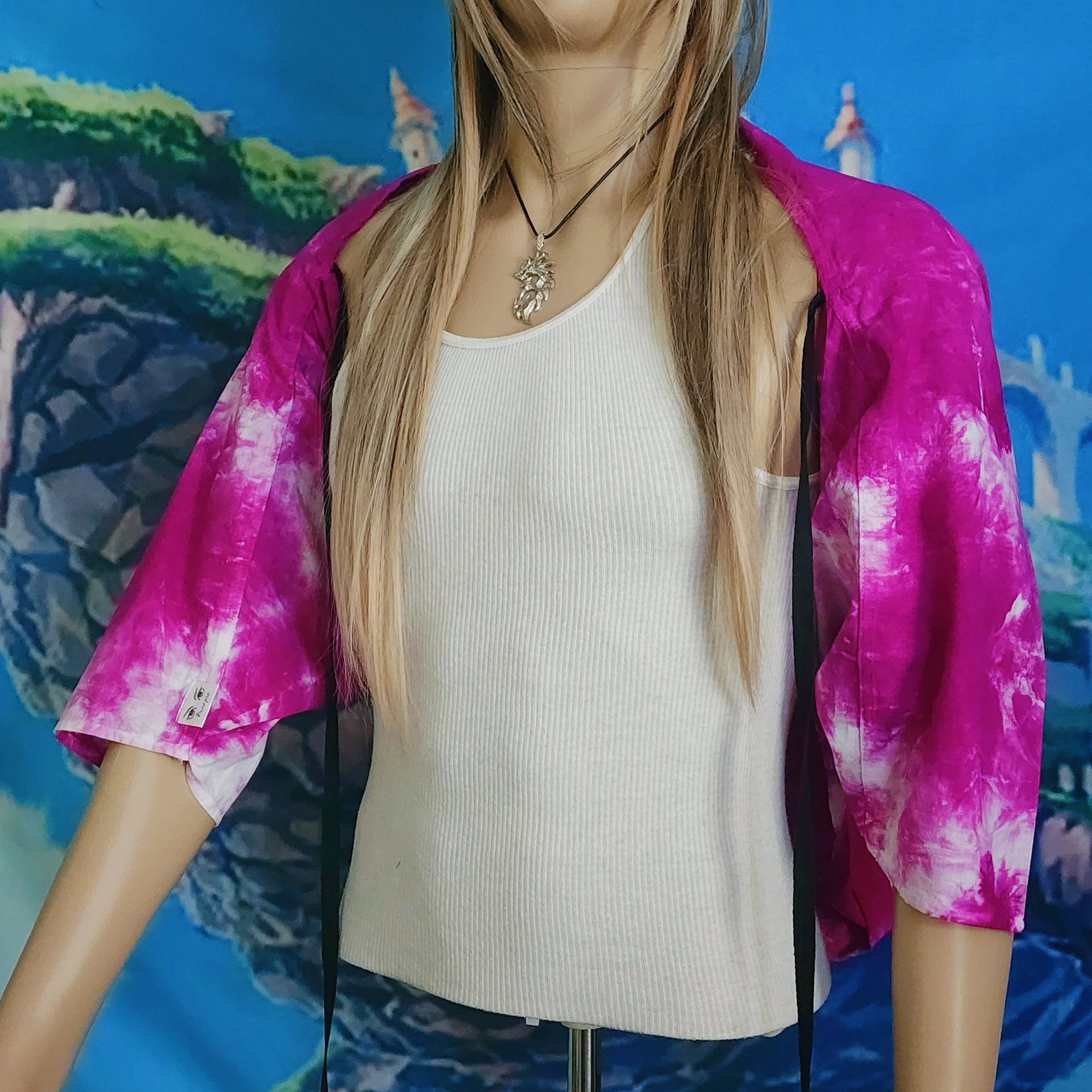 A light off-shoulder jacket. Perfect for protecting your skin from the sun in summer, or layering as a conversation piece in any season. Handmade, hand-dyed with fiber-reactive dyes. 100% cotton, custom-printed art applique, a polyester satin accent tag, and cotton twill ties that may be tied in the front or back underneath the arms to keep it from falling off your shoulders during strenuous tasks.