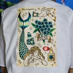A light, crisp, 100% linen jacket jacket with a 100% cotton printed applique on the back featuring a beautiful merman and his lovely trinkets. Twill ties for tying around the waist, or under the arms to keep the jacket from falling off your shoulders. Finished with rolled, not serged seams, so it is less likely to feel scratchy on the skin.